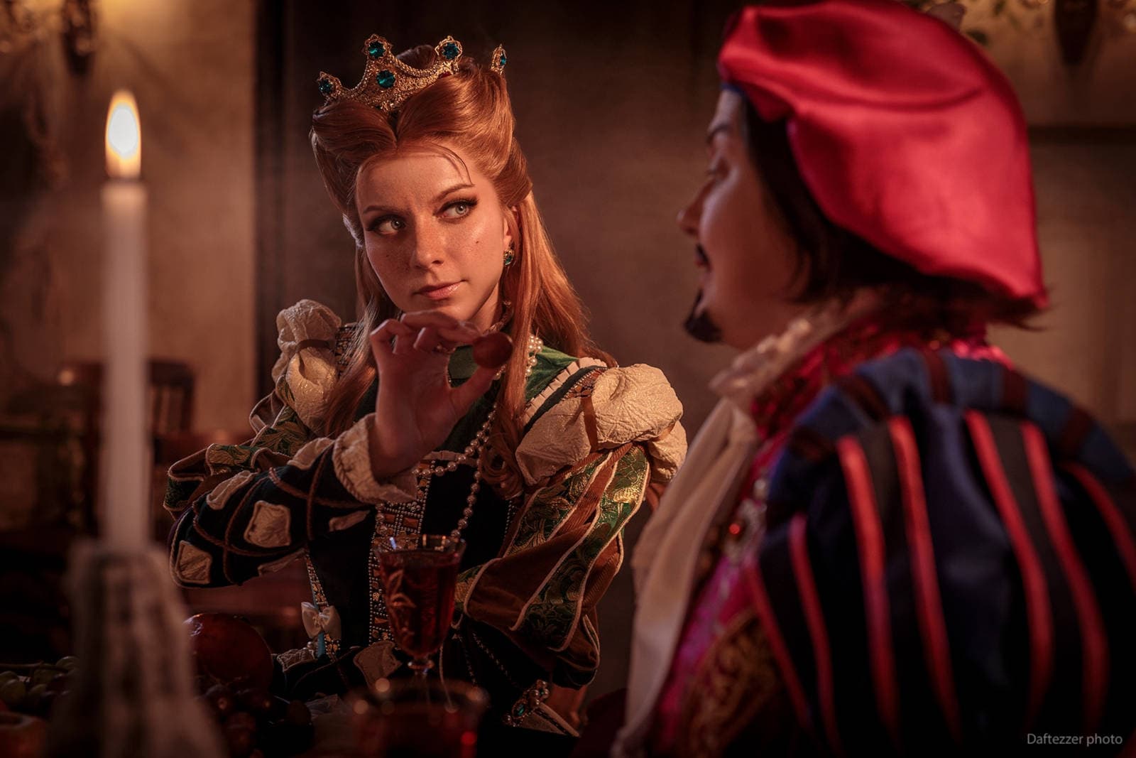During her photo shoot, cosplayers Marshal Giltenkreuz and Evge-Nii Admiral transformed into characters from the role-playing action The Witcher 3: Wild Hunt, such as the Duchess of Toussaint Anna Henrietta and the most famous bard in the North, Dandelion.