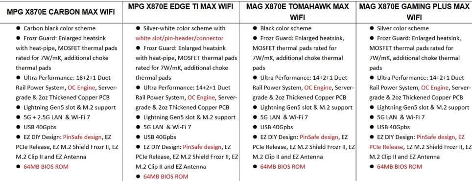 MSI is already preparing for the new generation: B850I EDGE TI EVO WIFI with improved solutions for future CPUs. MAX series 800 boards, such as MPG X870E CARBON MAX WIFI and MAG X870E TOMAHAWK MAX WIFI, are equipped with an external BCLK generator and 64 MB BIOS, which will accommodate new microcodes and support future Ryzen without firmware issues.