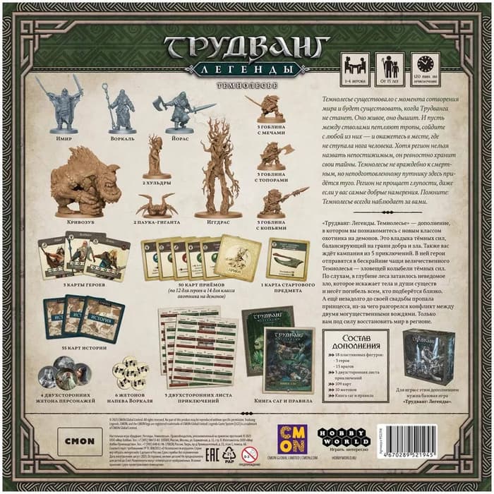 In addition, users will be able to crush new opponents, take part in dangerous events and get cool items. The "Darkfen" box contains 18 plastic figures - 3 heroes and 15 enemies, three double-sided adventure sheets, 109 cards, 10 tokens, a book of sagas and game rules.