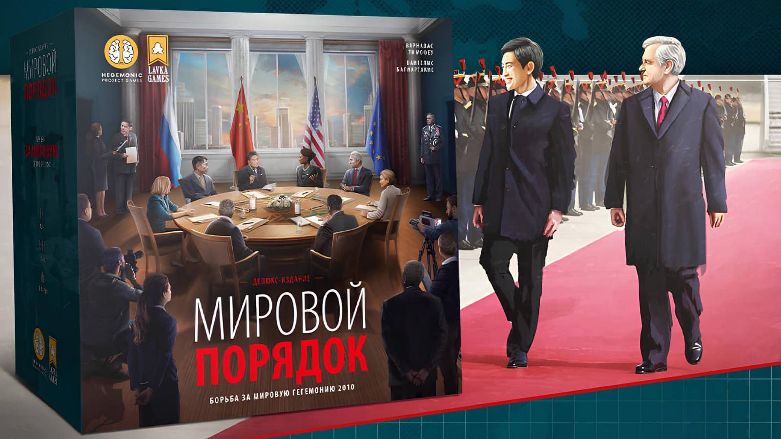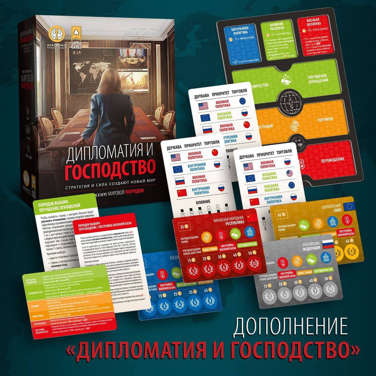 "World Order" is a board game project for territory control with asymmetric factions and deck-building elements. Participants will have to lead one of the four leading world powers on the political stage of 2010: Russia, the USA, China, and the European Union.
