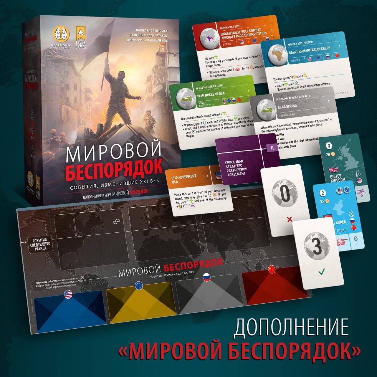 The "Diplomacy and Domination" expansion adds new challenges and modes to the game, challenging gamers' geopolitical skills, strategic advantages and development cards. And thanks to the "World Disorder" expansion, it will be possible to evaluate 60 new event cards.