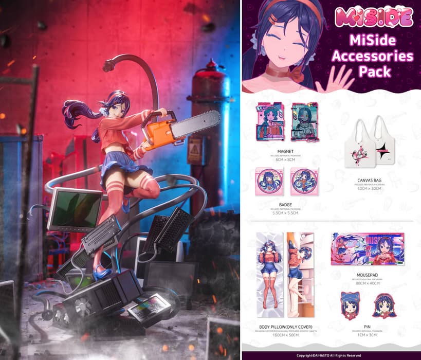 Thanks to a new crowdfunding campaign, avid fans of the adventure horror MiSide have a chance to acquire special Mita statues, made in 1/6 and 1/7 scale, as well as themed keycaps, magnets, badges, a mouse pad, and even a pillowcase.