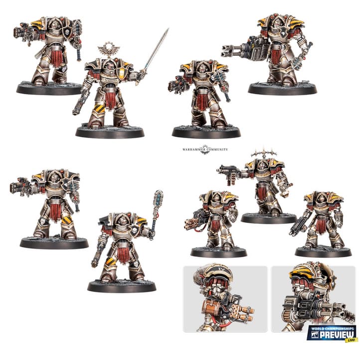 The contents of the box set ultimately look like this: a squad of six Terminators in Cataphract armor with hammers and volkite guns, six Terminators with combi-bolters and power fists, ten Breacher squad fighters, a Leviathan Dreadnought with a siege claw and drill, decal sheets for Space Marines and the Dreadnought.