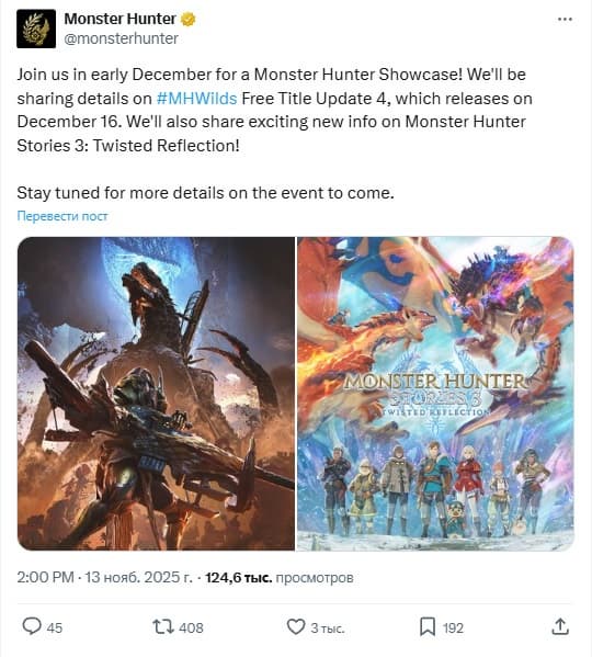 The main item on the program will be Title Update 4 for Monster Hunter Wilds, which is scheduled for release on December 16. The update will feature the giant Gogmazios, endgame expansions, performance improvements, weapon enhancements, and a new seasonal event. Monster Hunter Stories 3: Twisted Reflection, which will be released on March 13, 2026, will receive new plot and gameplay details.