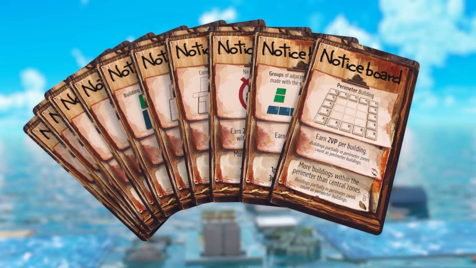 Players will play tiles, expand their settlement, manage resources, erect buildings, and direct survivors across platforms made of rusty metal and drifting wood.