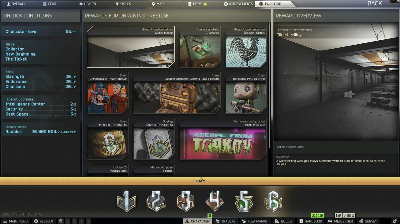 Escape from Tarkov has a "Prestige" system — upon reaching a certain level and fulfilling a number of conditions, players can start the game anew. They retain profile statistics, a small percentage of skills, and some items, and are rewarded with cosmetic content and various bonuses.