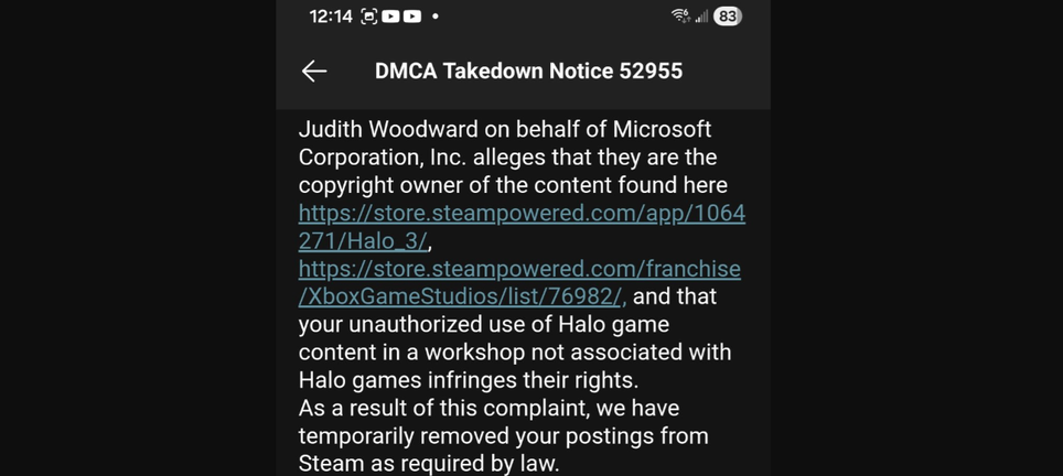 Judith Woodward, acting on behalf of Microsoft Corporation, Inc., states that they are the copyright holder of the content [Halo 3 and Halo: The Master Chief Collection], and that your unauthorized use of Halo game content in the "Workshop," unrelated to Halo games, infringes their rights. We have temporarily removed your mods from Steam in accordance with legal requirements.
