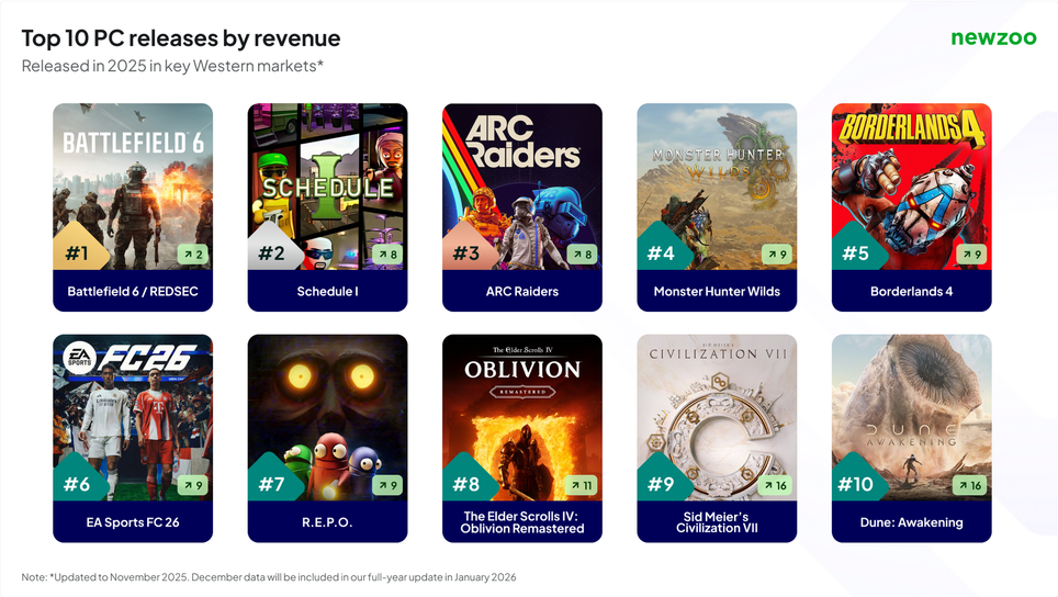 On PC, the top 10 games by revenue for the year consist exclusively of premium games released in 2025, without free-to-play projects. The list includes two indie games and three completely new franchises.