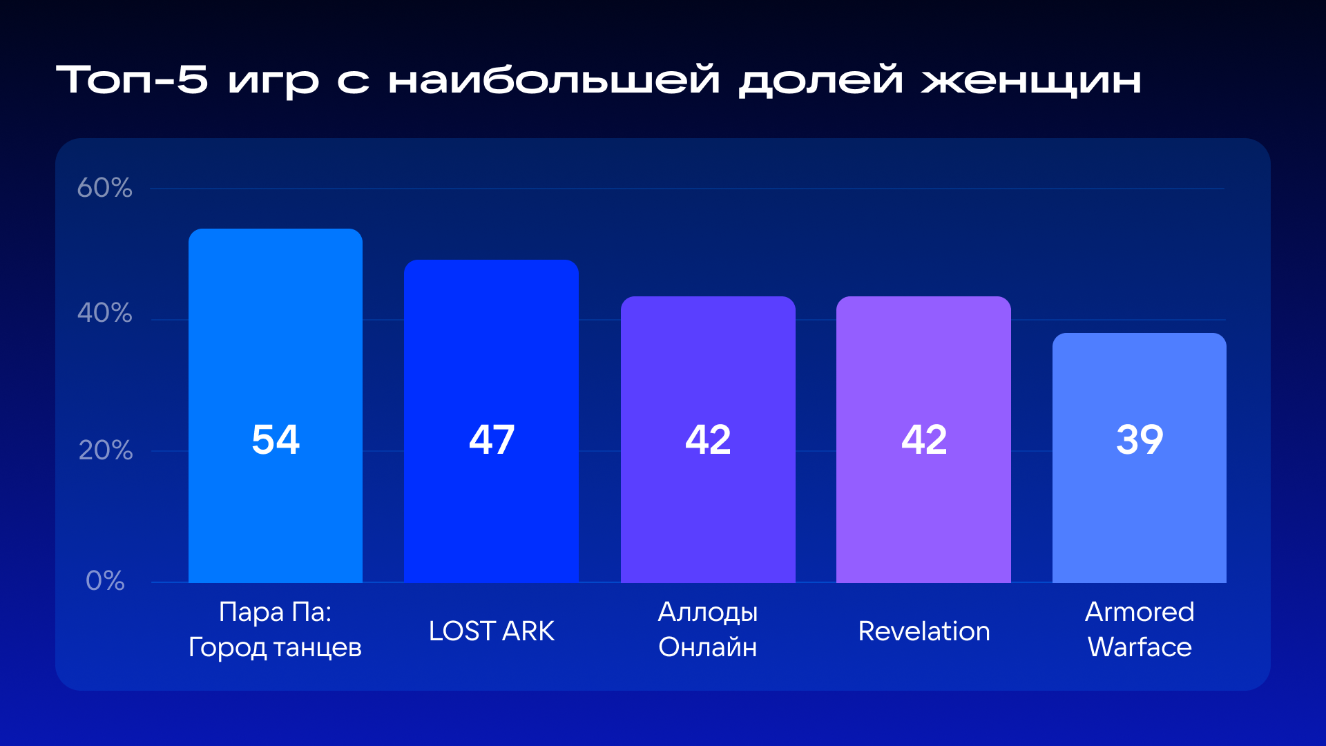 The female audience spent time in MMOs and competitive games: «Пара Па: Город танцев», LOST ARK, «Аллоды Онлайн», Revelation, and Armored Warface.