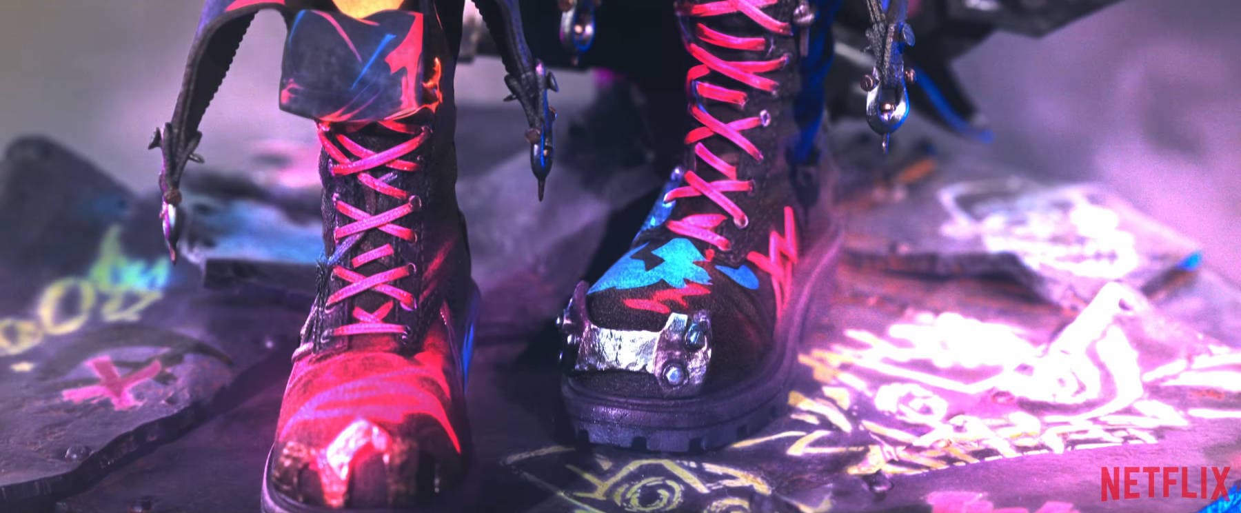 In addition, Jinx is a talented mechanic. In battle, she uses the "Pow-Pow" minigun and the "Fishbones" rocket launcher. The heroine's blood contains a modified drug called Shimmer, which grants superhuman speed and strength - this is manifested in the light of her purple eyes.