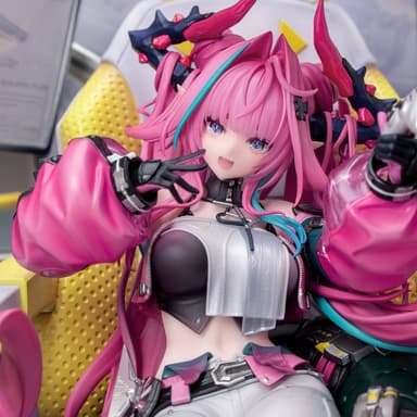 This collectible item is made of ABS plastic, polyvinyl chloride, and metal. Ivonne sits in an ergonomic chair surrounded by multiple displays. She wears a carefully fitted top and leggings with a gradient transition from white to pink.
