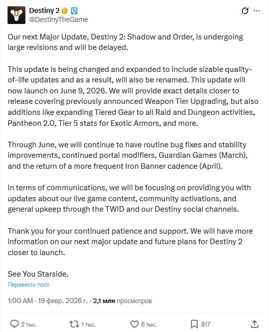 However, Bungie has confirmed the delay. The update is undergoing "major changes" and will only be released on June 9, 2026. The developers stated that they are "modifying and expanding" the content, adding significant quality improvements, and also plan to change the name to better reflect the scale of the changes.