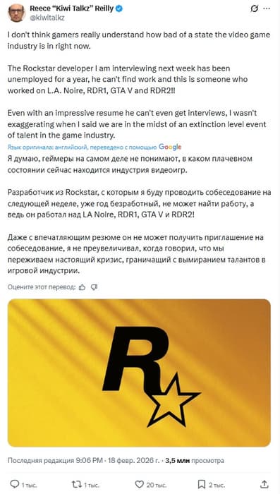 As proof, he cites the story of a developer with a powerful resume that anyone would be proud of: participation in the creation of GTA V, two parts of Red Dead Redemption, and L.A. Noire. Despite this, he has been unemployed for a year and cannot pass interviews in other studios.