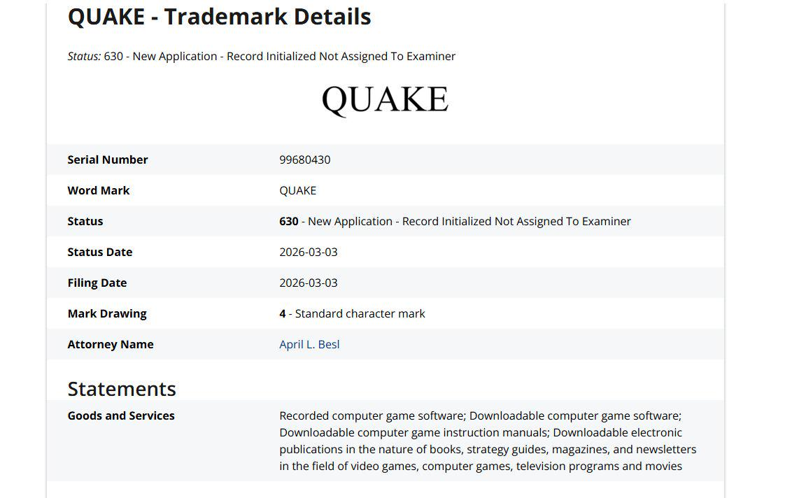 However, this action does not guarantee that a new part of the Quake franchise is in development. It may be a simple formality to protect the rights to the franchise.
