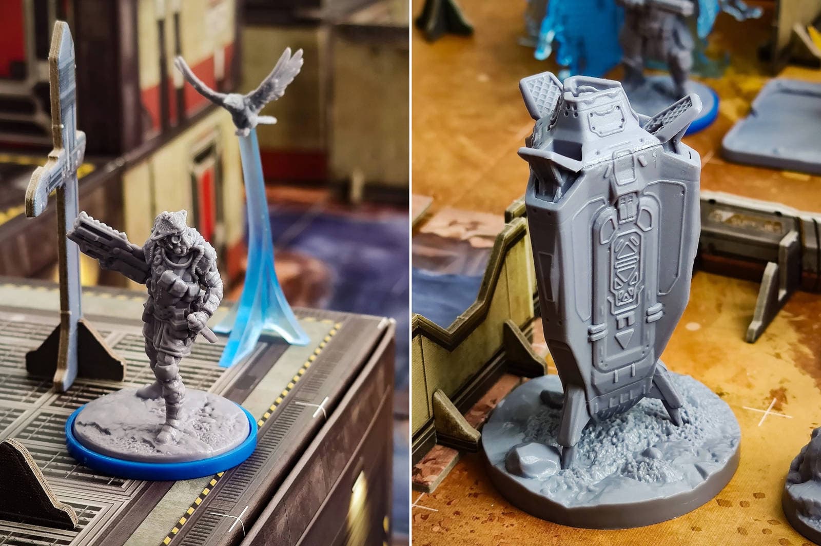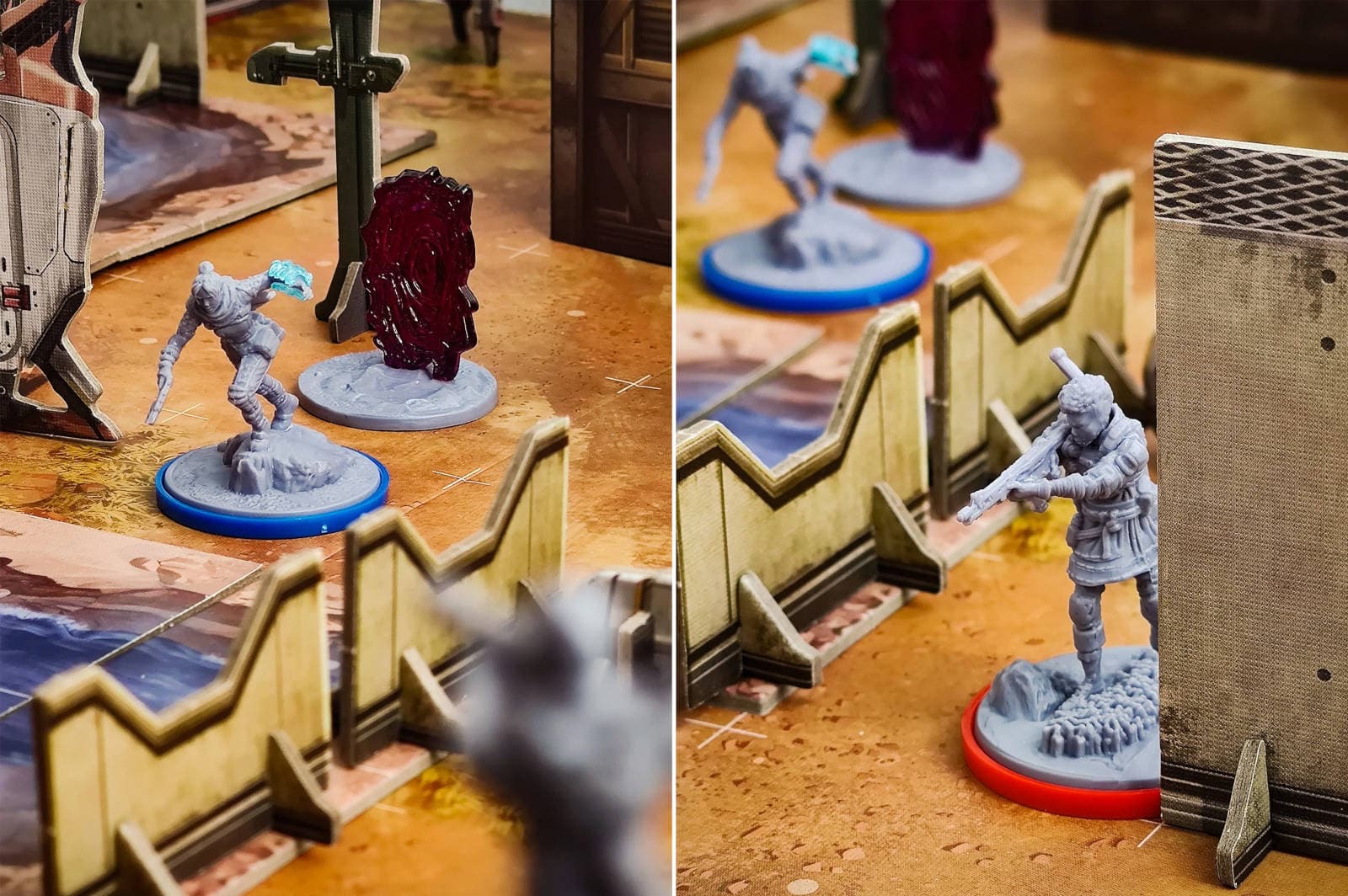 The basic box contains six Legend miniatures, 15 Legend effect miniatures, four barrier miniatures, four field elements, nine canyon elements, 15 buildings, 82 3D landscape elements, 15 tablets, 238 cards, 300+ tokens, four bags for loot tokens, six shield/health point counters, six rings for miniature bases, six cards with Legend descriptions, six player screens, six equipment tablets, seven memos, game rules and a match booklet.