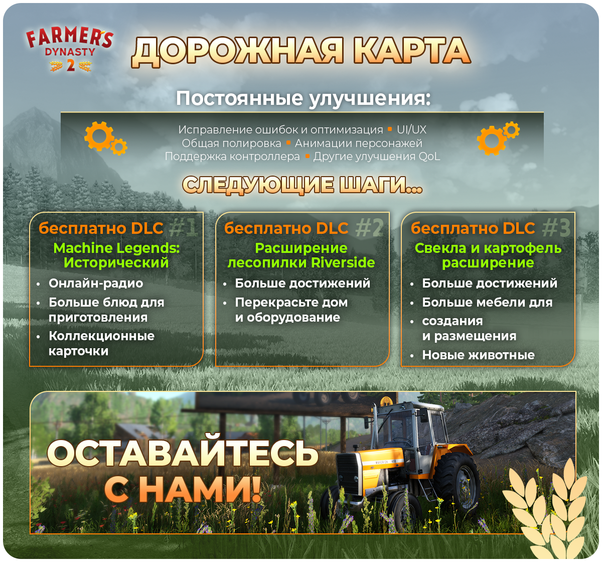 Work on the farm never ends, and for us, this is just the beginning. We are already working on the next stage and are happy to share with you the early access roadmap. During early access, you will find free updates and expansions that will deepen the gameplay and open up new opportunities on the farm, such as Machine Legends: Historical, Riverside Sawmill Expansion, and Beets & Potatoes Expansion.