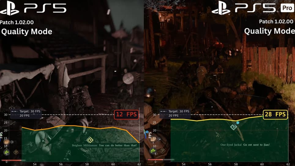 Even the PlayStation 5 Pro does not provide stable performance. In quality mode, designed for 30 FPS, the base PS5 drops to 12 frames, while the Pro stays at 20–22 FPS.