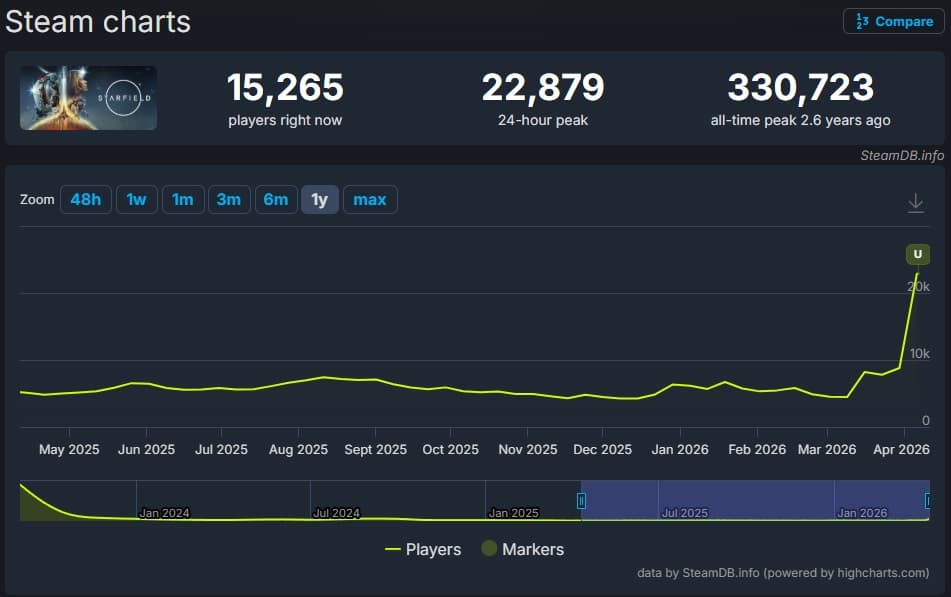 Starfield is experiencing a new surge in popularity on Steam - the game hasn't reached such numbers in almost 2 years.