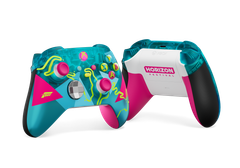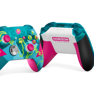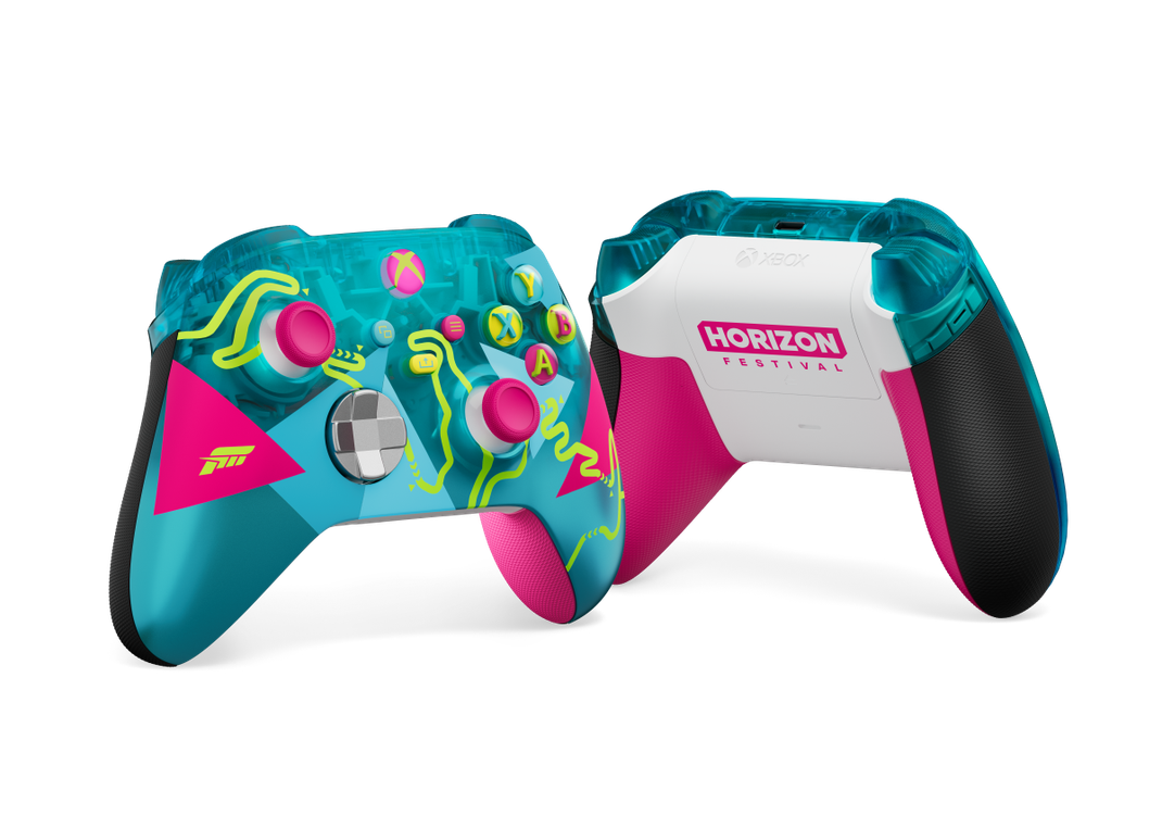 The Xbox Wireless Controller: Forza Horizon 6 Limited Edition features a transparent cyan body with a metallic gradient, green, bright pink, and silver accents, a metallic D-pad, and two-tone rubberized grips with a diamond pattern.