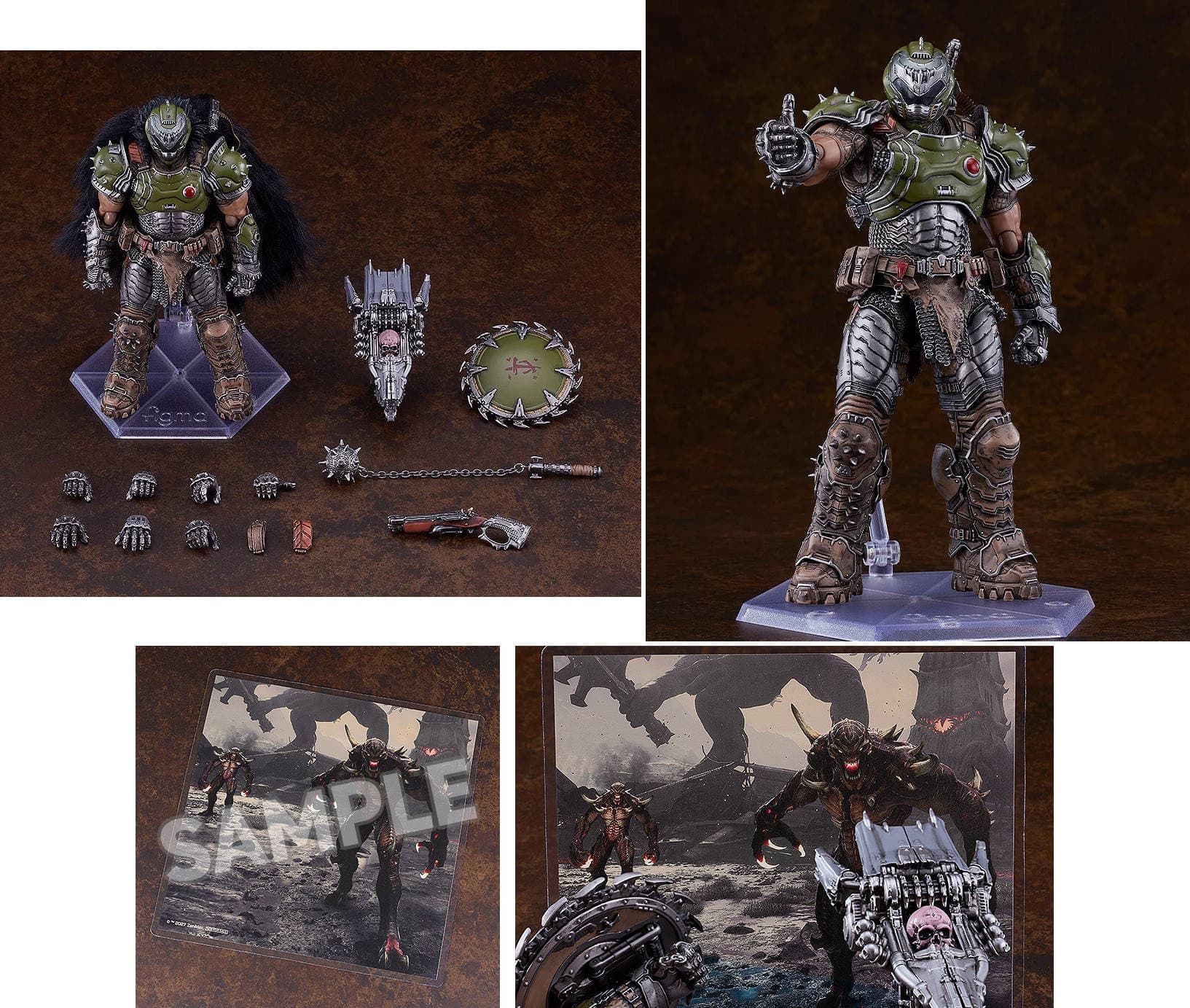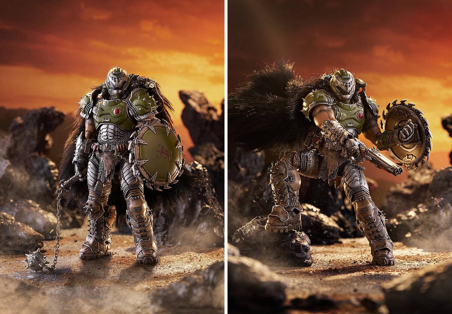 The more expensive set includes a 17-centimeter articulated plastic body, a flail, a super shotgun, a shield saw, the Skullcrusher pulverizer, interchangeable hands, a shoulder part for attaching and detaching the cape, a stand, and a themed backdrop.