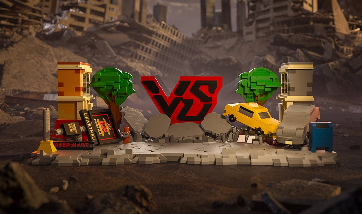 The arena's gray road is cut through by deep cracks, while behind it tower chunks of concrete surrounding the red-and-black "VS" logo, positioned between tall trees and destroyed storefronts.