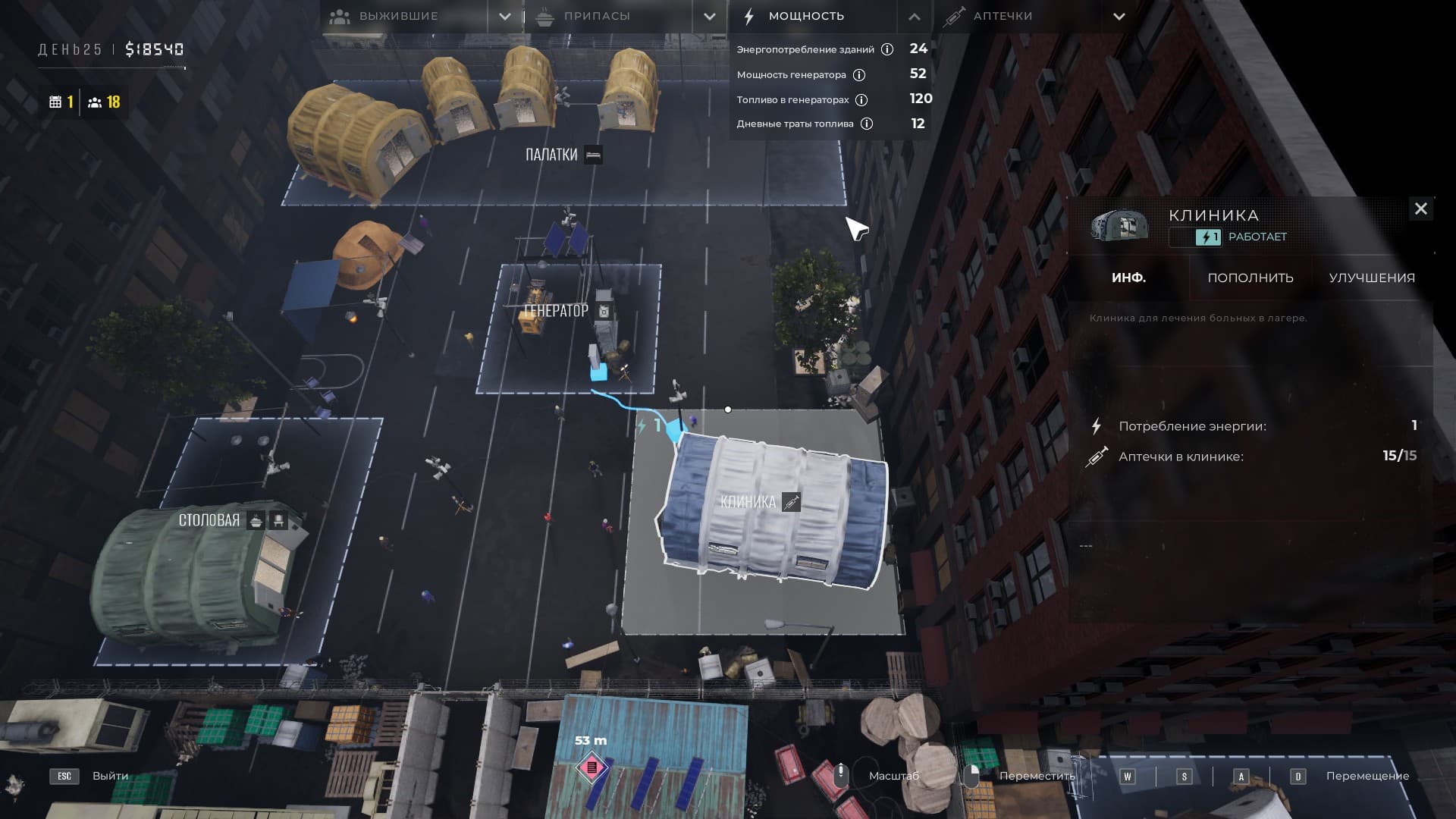 Money is needed to buy base improvements. You will have to make sure that everyone has enough of everything, and regularly buy food and medicine. The entire base is supported by only one generator. If it breaks down, the player will have to deal with it himself. If a survivor does not have enough resources or space, he will die, and the authorities will issue you a fine.