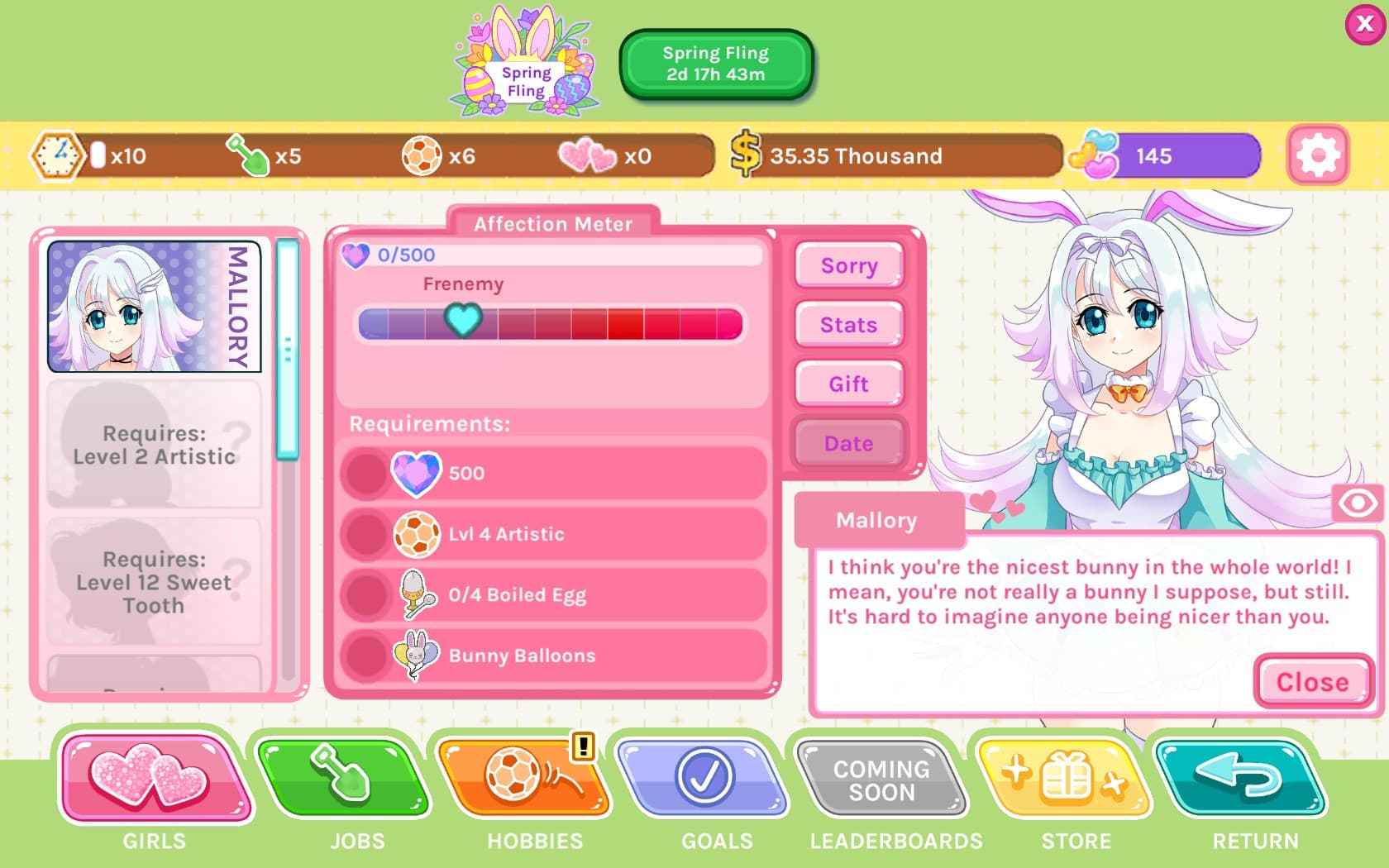 Cada encuentro comienza con un fracaso: el héroe logra arruinar la relación y tiene que restaurarla. El juego se reduce a hacer clic monótonamente en el retrato de la elegida. El proceso se acelera mejorando los pasatiempos, lo que aumenta las características del personaje. Para pasar al siguiente nivel de amor, debes ir a citas y colmar a tu amiga de regalos. Esto lleva una tonelada de tiempo y dinero virtual.