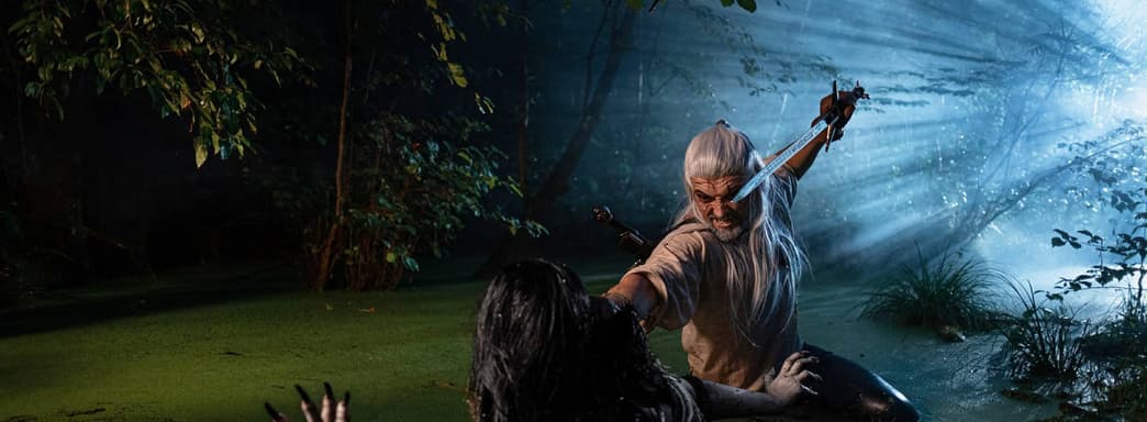 El cosplayer Iván Kondrashin se transformó en Geralt del juego "The Witcher 3: Wild Hunt" para luchar contra la Dama del Agua, interpretada por la modelo Daria Sherman, en uno de los pantanos de Velen.
