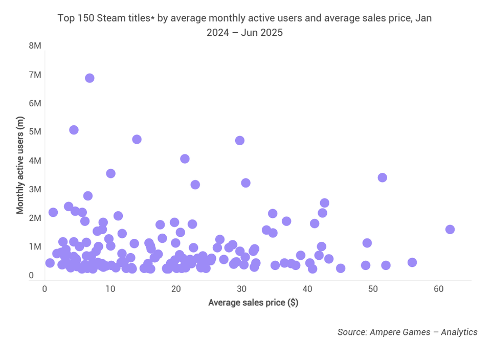Recientemente, en Ampere Analysis decidieron estudiar los juegos de Steam. En el curso de la investigación, los analistas examinaron los precios de 150 juegos con la mayor métrica MAU (audiencia activa mensual); de la muestra se excluyó Counter-Strike 2.