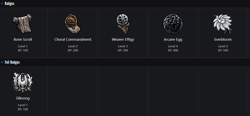 A partir de las tarjetas se recogen insignias: una normal (5 niveles) y una metálica (1 nivel), que recibió el nombre de «Silksong».