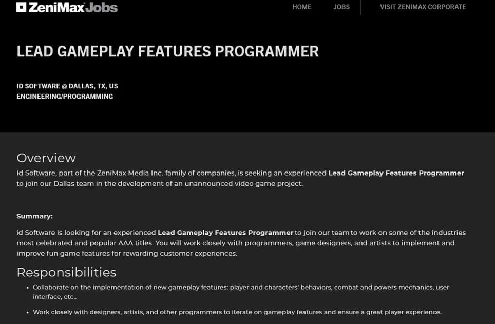 ZeniMax ha abierto una posición para Lead Gameplay Features Programmer en la oficina de Dallas. Se pueden hacer conjeturas sobre posibles proyectos, pero se sabe que esta división ha ayudado principalmente a otros equipos. El estudio no ha hecho un juego grande completo en mucho tiempo. De la descripción de la vacante se desprende que se trata de un proyecto AAA que también saldrá en consolas. El candidato trabajará en nuevas posibilidades de juego.