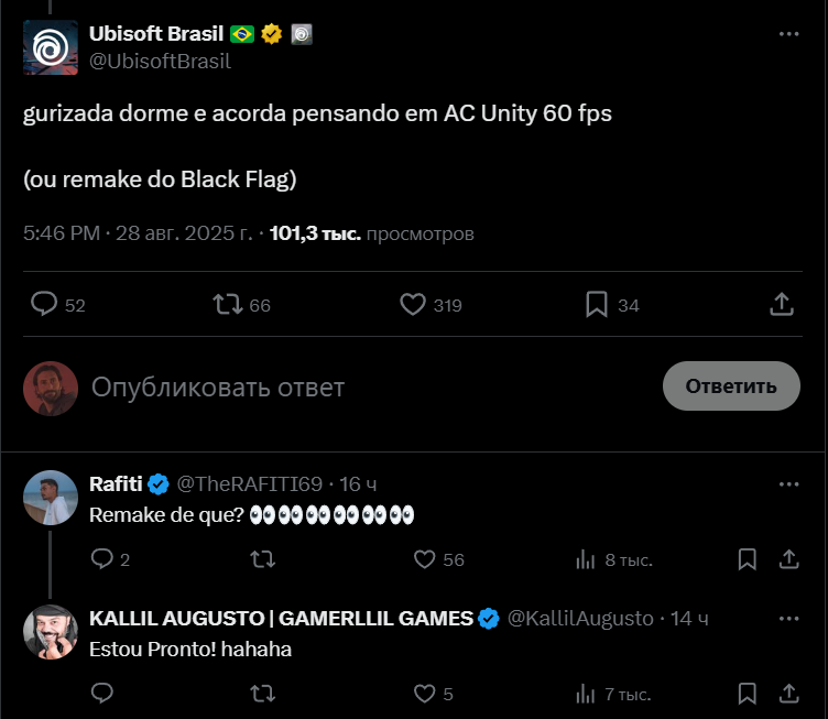 El tema del remake fue inesperadamente planteado por la división de Ubisoft Brasil, respondiendo a la publicación de un fan. El jugador escribió que sueña con ver Assassin’s Creed Unity a 60 fotogramas por segundo, a lo que los franceses reaccionaron con una breve réplica: «Los jugadores se duermen y se despiertan pensando en AC Unity a 60 fps (o en un remake de Black Flag)». Esta es una mención directa del proyecto del que se habla desde hace mucho en la comunidad.