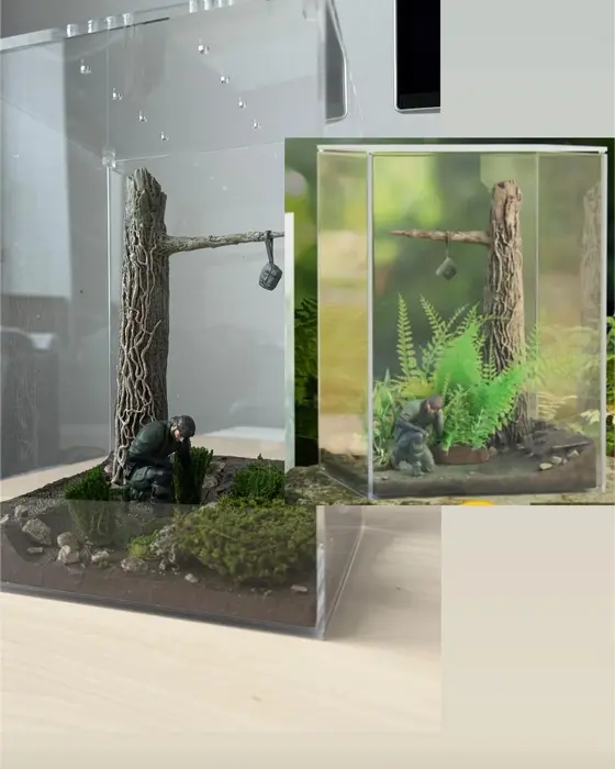 Otro problema fue la vegetación en el diorama. En los materiales promocionales, la base del diorama estaba llena de densos arbustos y plantas, creando la sensación de una jungla en la que se esconde Snake. Sin embargo, en realidad, el diorama está cubierto solo con una fina capa de musgo.