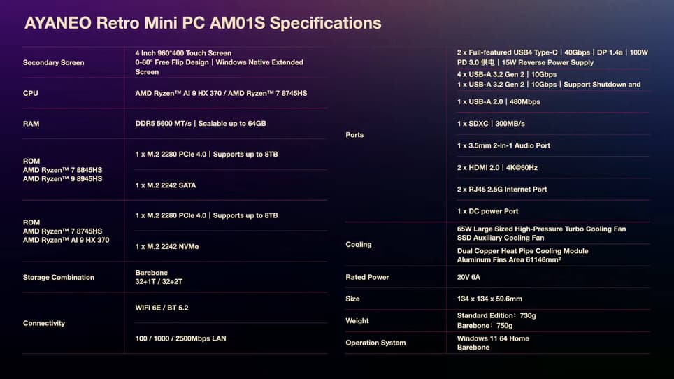 En noviembre, algunas personas podrán evaluar personalmente el mini-PC con diseño retro Ayaneo AM01S, que recibió una pantalla táctil de 4 pulgadas con ángulo de inclinación ajustable, procesadores AMD Ryzen 7 8745HS y AMD Ryzen 7 8745HS, así como dos opciones de color.
