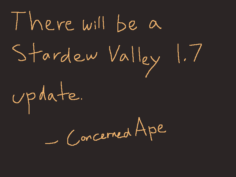 «De acuerdo, hablé de esto en un concierto ayer, y la información se difundió, así que lo confirmo para todos: habrá una actualización 1.7 de Stardew Valley. Aún no hay fecha de lanzamiento. Pero saldrá».