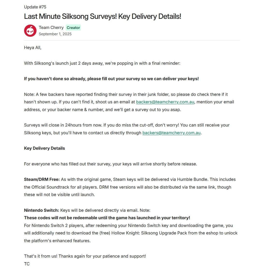 En el lanzamiento, Hollow Knight: Silksong saldrá en la versión estándar para Nintendo Switch. Los propietarios de Switch 2 primero tendrán que instalar el juego para la consola anterior. Después de eso, a través de eShop podrán descargar archivos adicionales: la actualización optimizará el juego para la nueva generación.