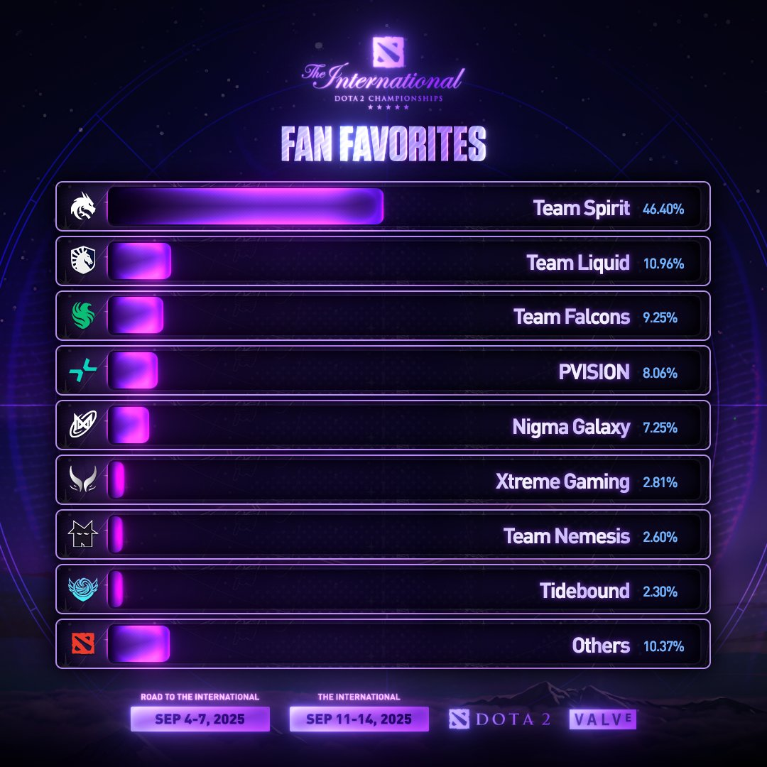 Preguntó: «¿Quién ganará The International 2025?». Después de más de 2000 votos, se determinó el favorito: el equipo ruso Team Spirit se adelantó con un 46%.
