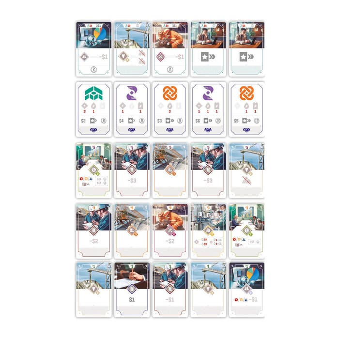 Dentro de la caja se podrán encontrar: el tablero de juego, cuatro tableros de empresa, cuatro fichas de parcela iniciales, cuatro ayudas de juego, 12 fichas de almacén, 26 cartas de parcela, 28 cartas de investigación, 114 cartas de acción, 22 cartas de contrato, 15 cartas de objetivo, 72 fichas de jugador, tres indicadores de valor de los activos, 12 fichas de parcela agotada, 24 fichas de dividendo, 12 fichas de precio, la ficha del primer jugador, nueve cartas para el modo individual y las reglas del juego.