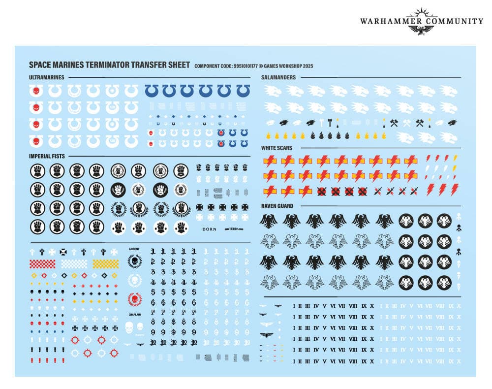 Además, el conjunto incluye una nueva hoja de calcomanías para Terminators, que incluye más de 500 pegatinas individuales para Ultramarines, Salamandras, Puños Imperiales, Cicatrices Blancas y Guardia del Cuervo, así como muchos iconos y distintivos universales.