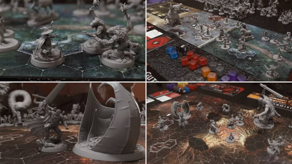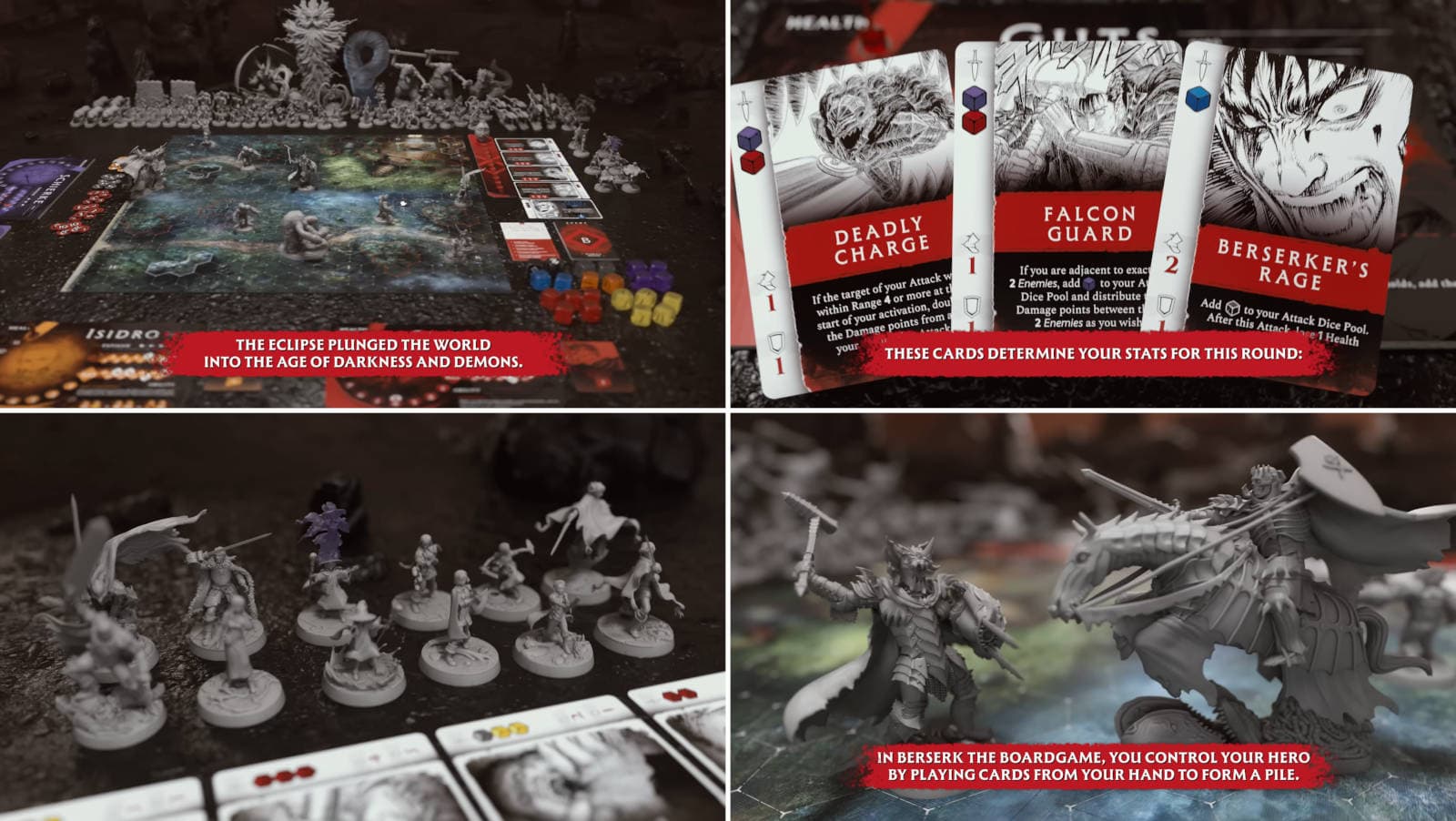 Berserk: The Board Game tendrá una комплектация bastante внушительная: muchas miniaturas (en el tráiler se indican 178 piezas, y en Gamefound – 123), 10 losetas de doble cara para cartas (en total – 20 cartas), un rastreador de turnos, Beherit, 10 tableros para héroes, 283 cartas de juego, 24 dados, más de 70 fichas y dos folletos con información útil.