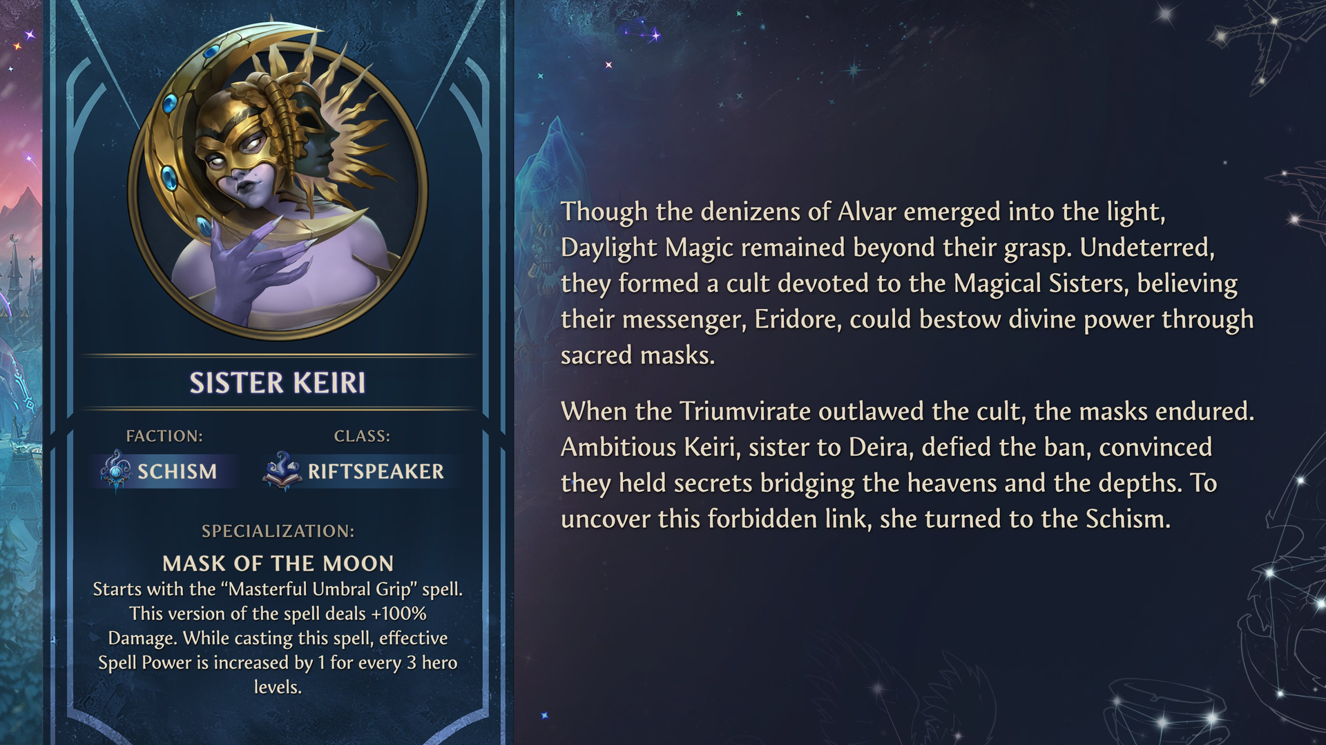 «Aunque los habitantes de Álvar salieron a la luz, la Magia de la luz del día siguió siendo inalcanzable para ellos. Sin inmutarse, fundaron un culto dedicado a las Hermanas-Magas, creyendo que su mensajera, Éridor, podía otorgar poder divino a través de máscaras sagradas. Cuando el Triunvirato declaró ilegal el culto, las máscaras siguieron existiendo. La ambiciosa Keiri, hermana de Deira, desafió la prohibición, convencida de que guardaban secretos que conectaban los cielos y las profundidades. Para revelar esta conexión prohibida, recurrió a [la facción Disrupción].