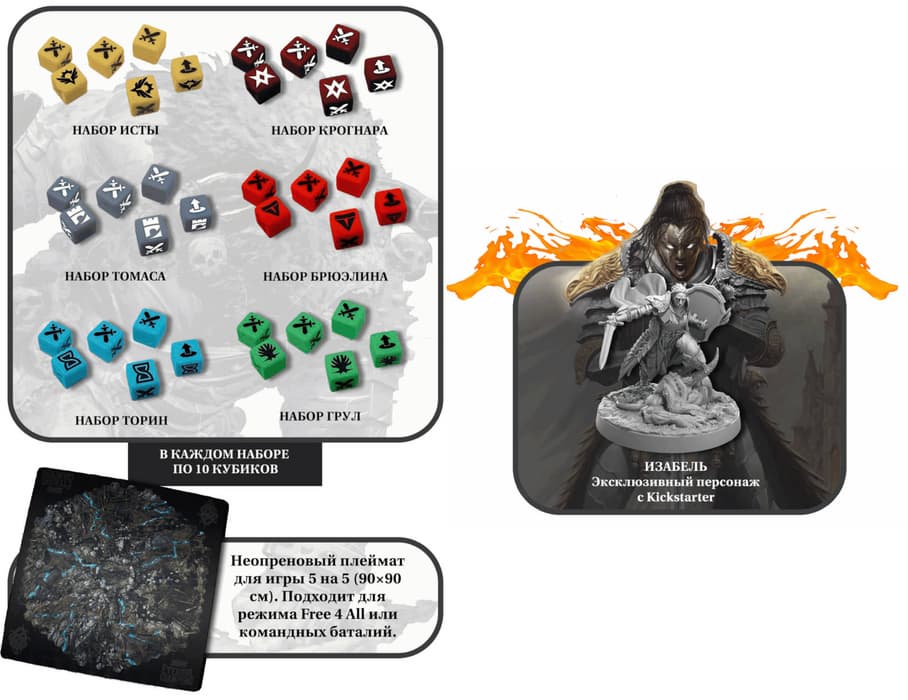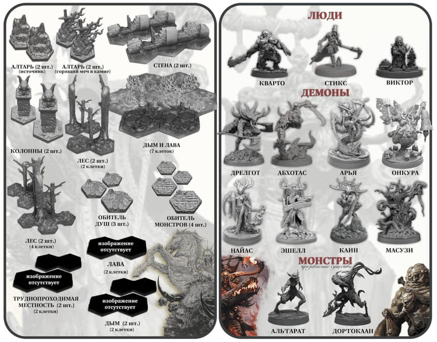 El paquete de terreno contiene 25 elementos: paredes, árboles y otros detalles del campo de batalla. En la caja de siete mil rublos se pueden encontrar 11 héroes y dos monstruos, que también se pueden utilizar como criaturas invocadas.
