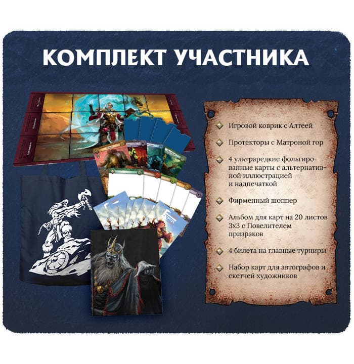 Por cuatro mil rublos, ahora puedes adquirir un kit de participante que contiene un tapete de juego con Altea, protectores con Matrona gor, cuatro cartas foil ultrararas con ilustración alternativa y sobreimpresión, un shopper de marca, un álbum para cartas de 20 hojas 3x3 con el Señor de los fantasmas, cuatro entradas para los principales torneos, un juego de cartas para autógrafos y bocetos de artistas.
