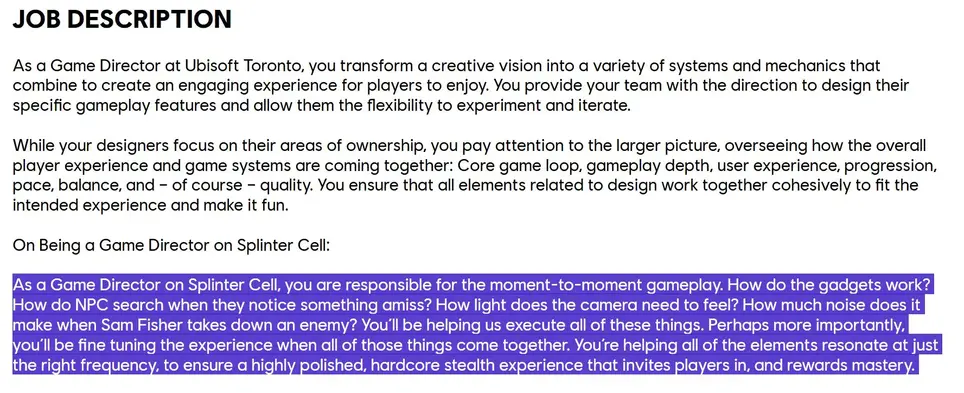 Ubisoft Toronto está buscando un nuevo director de juego para el proyecto. Según la descripción de la vacante, el nuevo director será responsable de los aspectos clave del juego, incluyendo la jugabilidad, la implementación de gadgets y el comportamiento de los personajes no jugables.