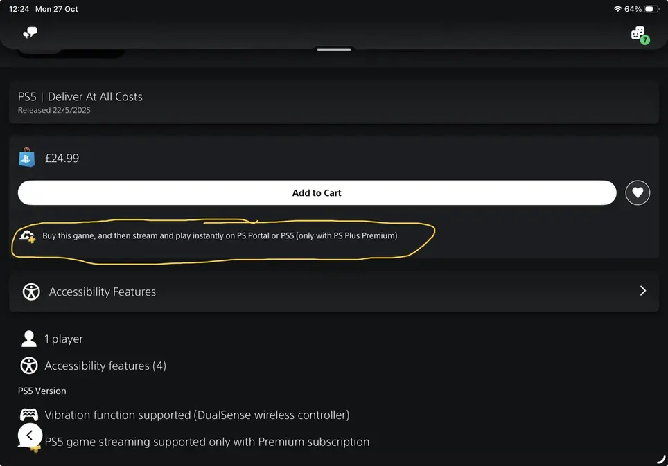 En el subreddit oficial de PlayStation Portal, el usuario GetTheWetsOn compartió una captura de pantalla de la página del juego Deliver at All Costs en la PS App. En ella se ve la confirmación de la posibilidad de transmisión en la nube a través de Portal. Según el usuario, información similar (que luego fue eliminada) también apareció en la página del remake de Dead Space.