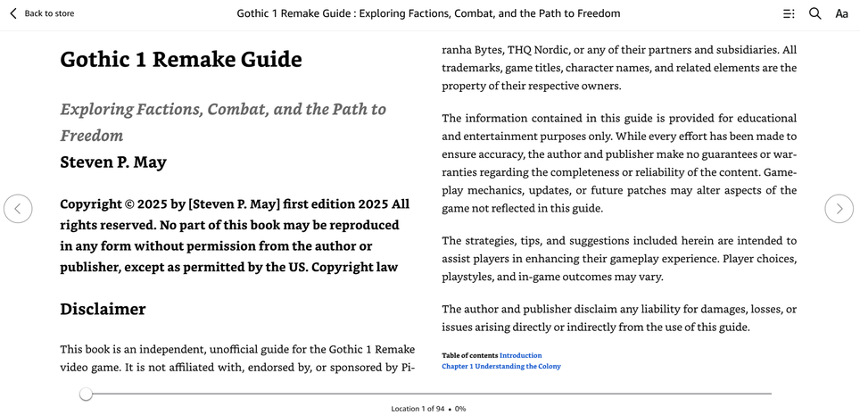 El autor indica al principio que se trata de un producto no oficial: esta guía para el remake de Gothic no está relacionada de ninguna manera con THQ Nordic, Piranha Bytes o sus socios.