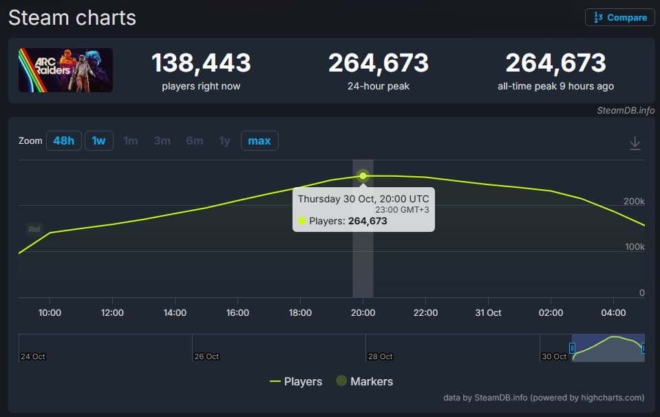El juego despertó interés incluso durante la fase de pruebas, pero el lanzamiento superó las expectativas. Inmediatamente después del lanzamiento, el número de jugadores en línea superó los 100,000 y pronto alcanzó los 264,000, un resultado superior al de las pruebas gratuitas. ARC Raiders entró rápidamente en la lista de los lanzamientos más populares de la semana en Steam.
