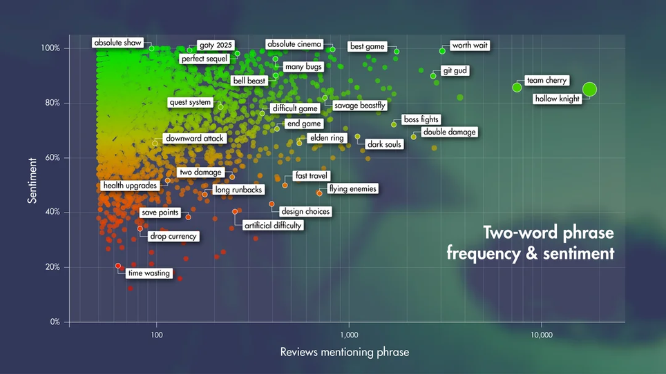 Analizó prácticamente todas las reseñas de Silksong en Steam, alrededor de 260 mil. Luego, elaboró un gráfico con las palabras populares, en el que se reflejaba su frecuencia, y se realizó una clasificación por tonalidad.