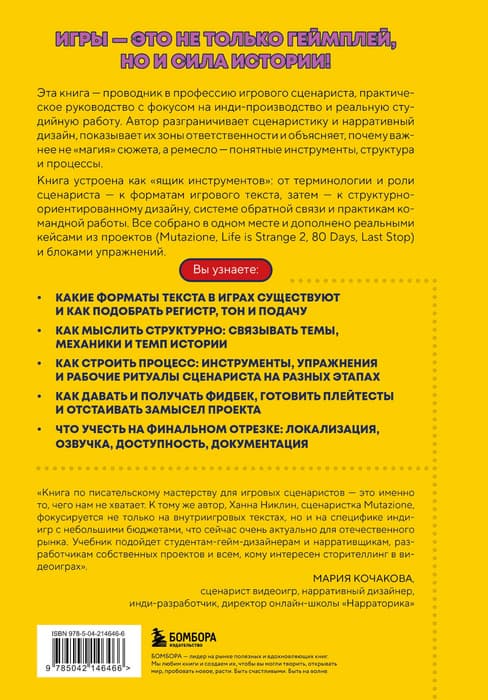 La editorial "Bombora" ha anunciado el lanzamiento del libro de Hanna Niklin "Cómo se escriben los juegos. Teoría, casos y práctica para el guionista de juegos". Aquellos que deseen adquirirlo deberán pagar 1899 rublos.