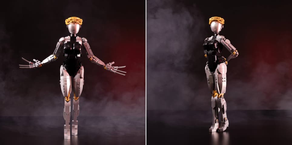 El kit contiene 677 piezas. El constructor es compatible con LEGO, por lo que será posible integrar elementos de otros sets. Hay un torso intercambiable con una chaqueta, por lo que puedes construir la Gemela Izquierda o Derecha. La altura de la figura terminada es de 36 cm. Tiene dedos, cabeza, brazos y piernas móviles.